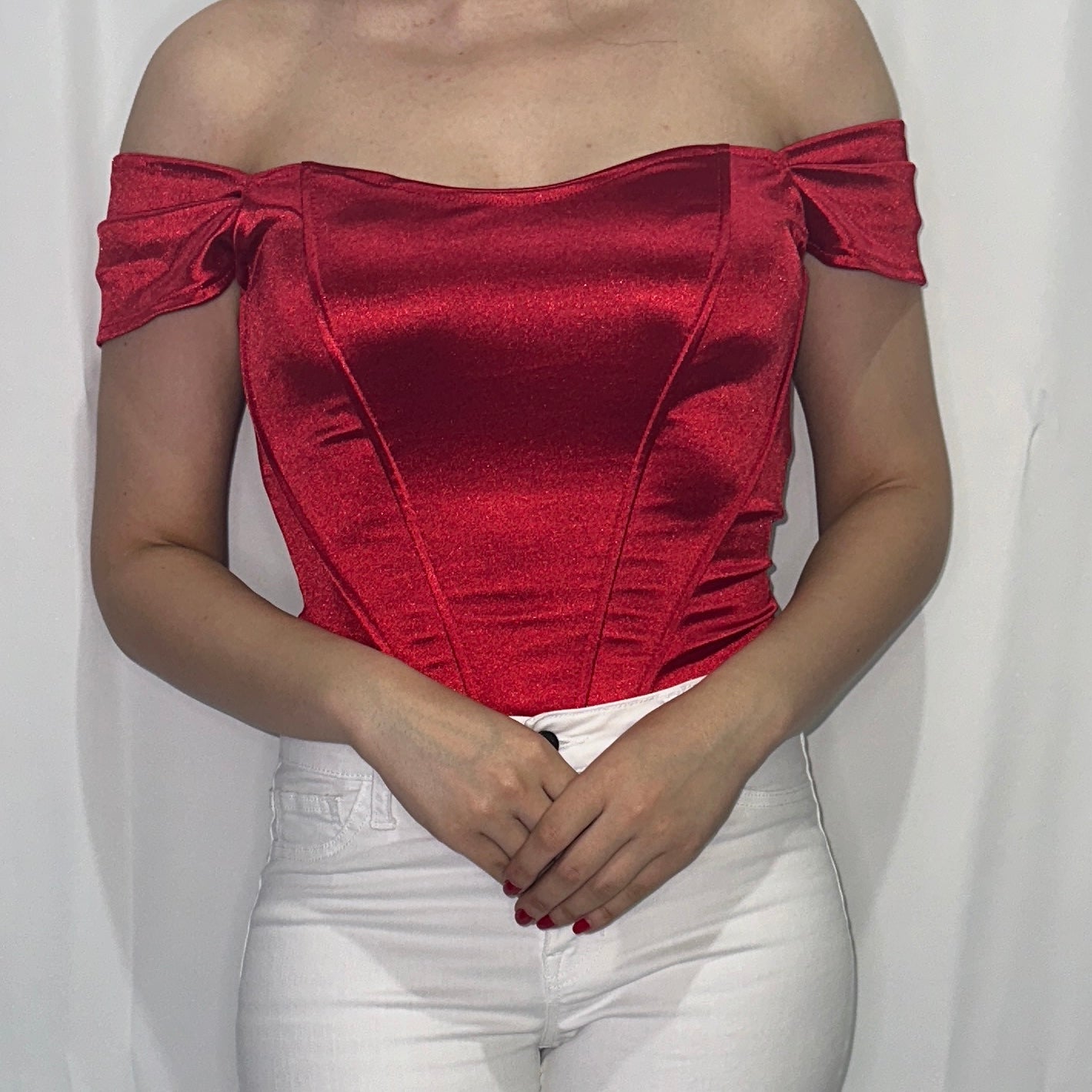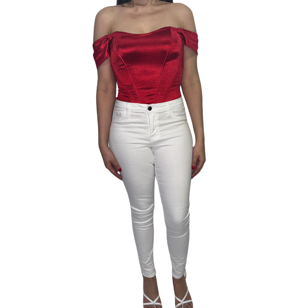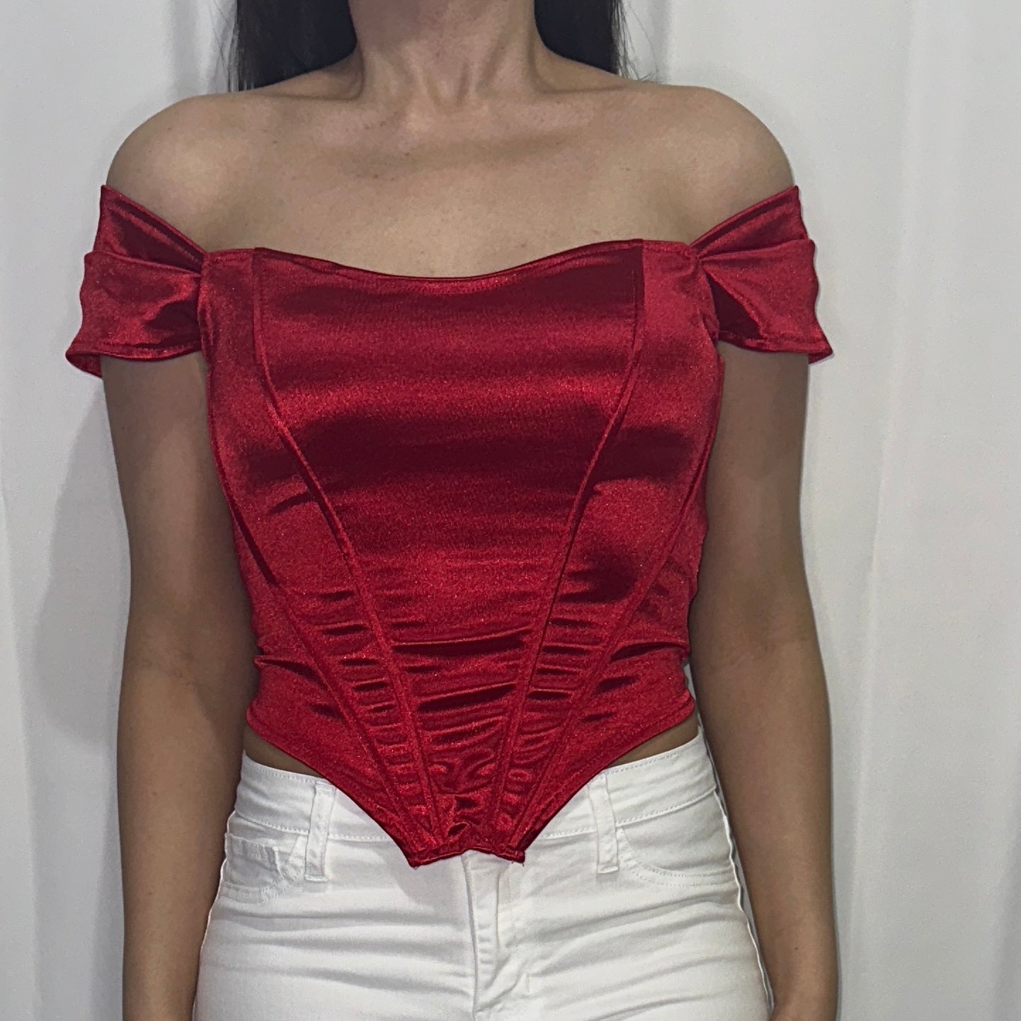 Off shoulder corset style red top.