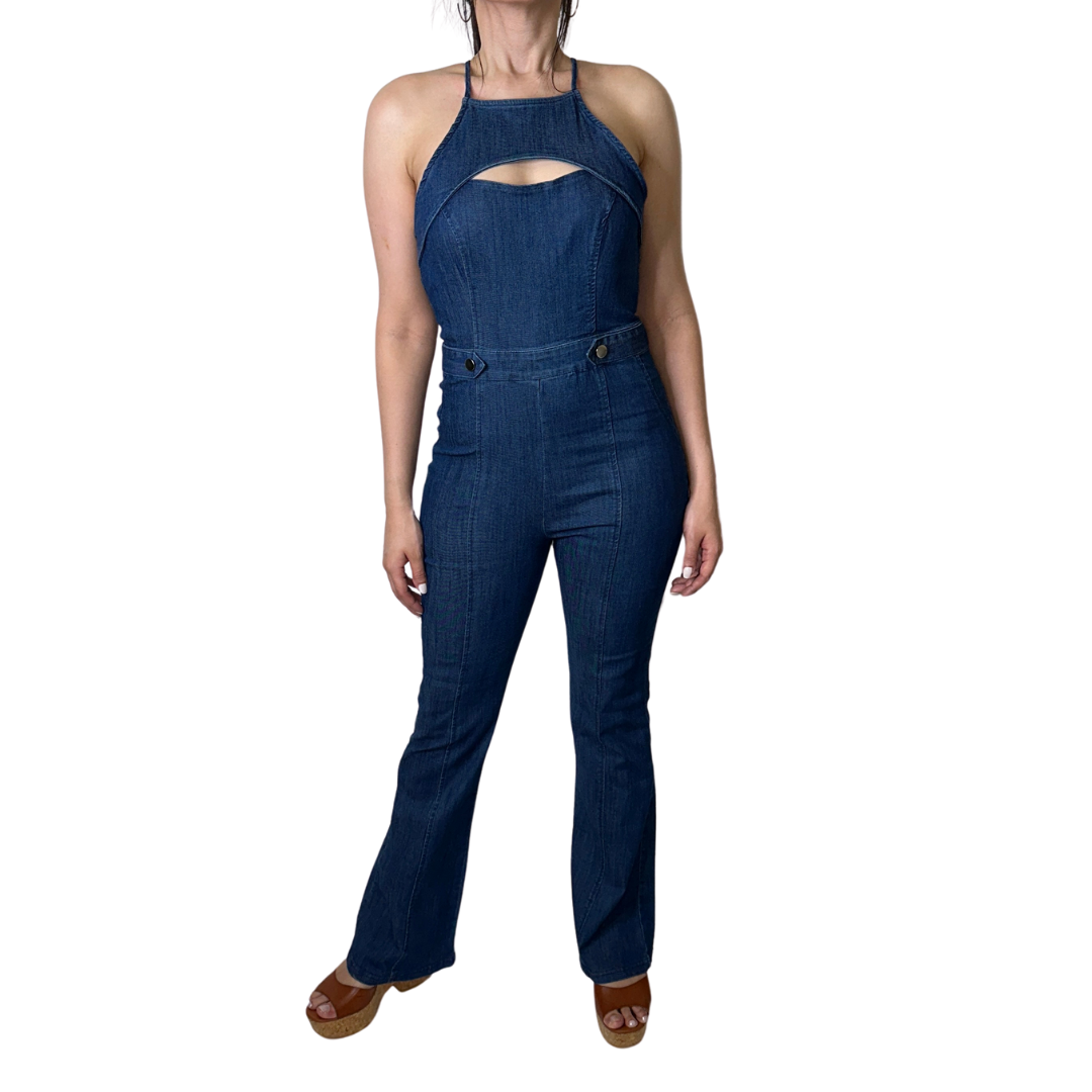 Flare denim jumpsuit with a front cut out detail. Zipper on the back.