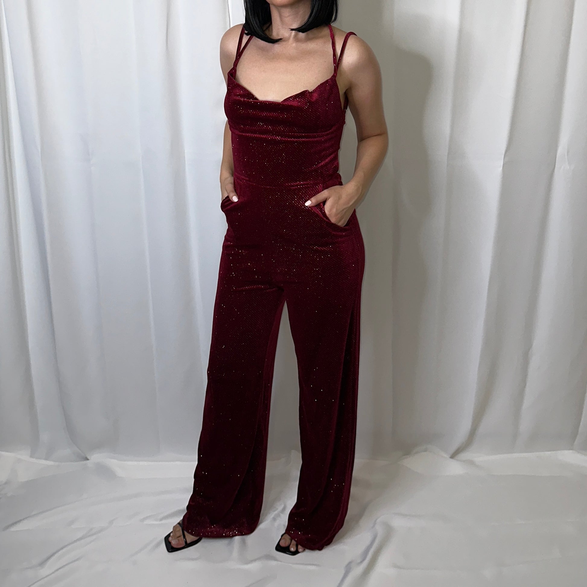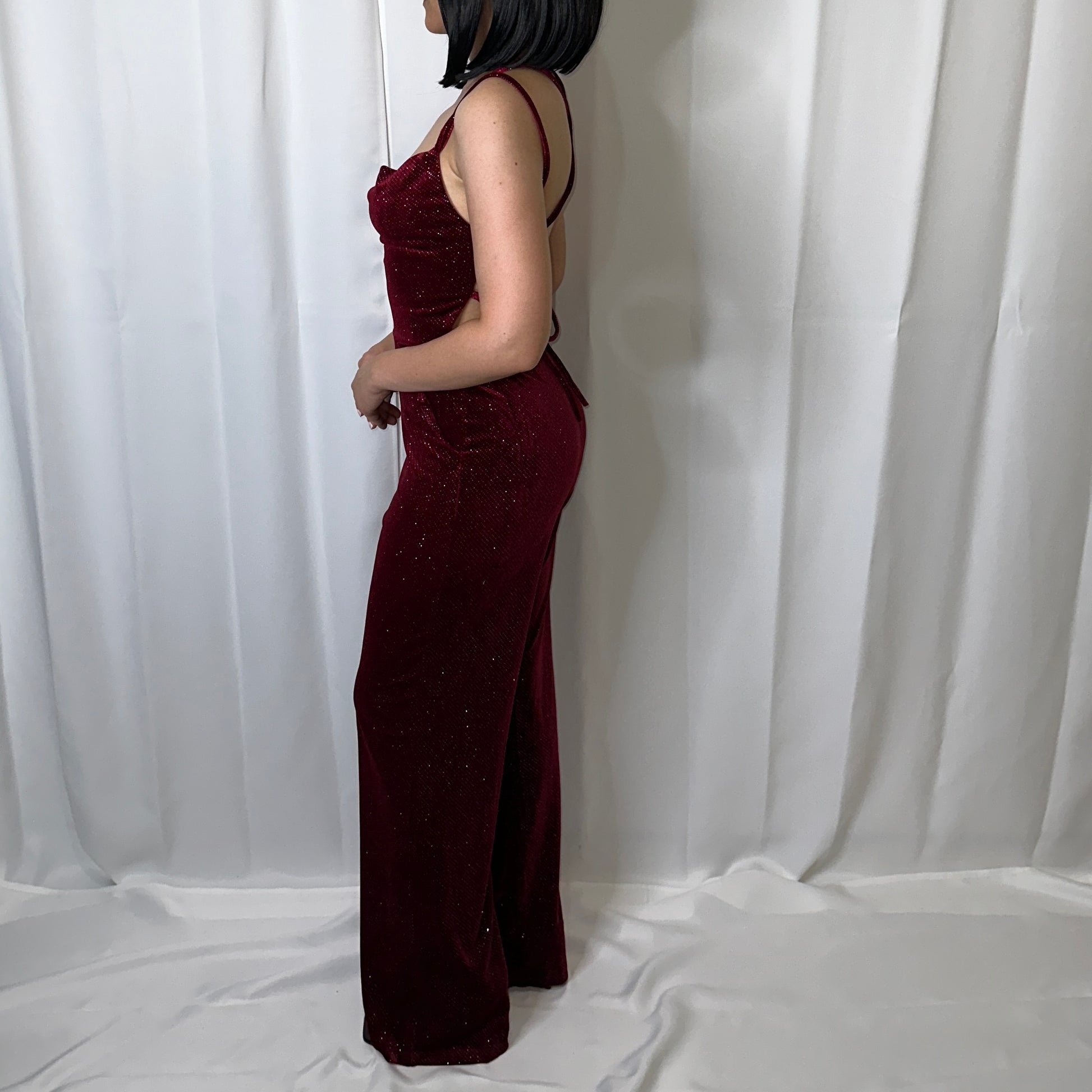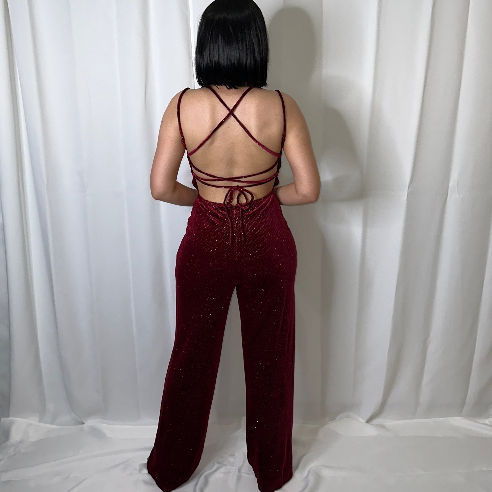 Crossed back burgundy glitter jumpsuit. Velvet fabric.